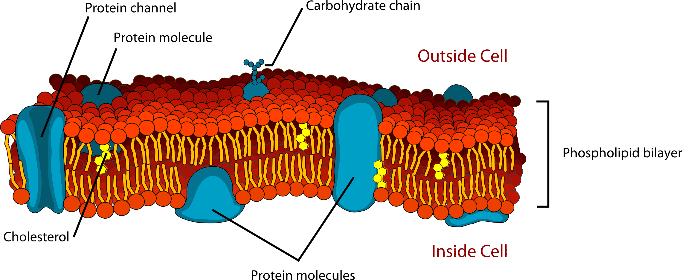 Cholesterol fits in with the phospholipids and helps to regulate the fluidity of the membrane. It does this by increasing fluidity at low temperatures by keeping the phospholipids apart and preventing a cease in motion. At higher temperatures, they have the opposite effect and reduce the fluidity of the membrane by holding the phospholipids in place and stopping them from moving too much.